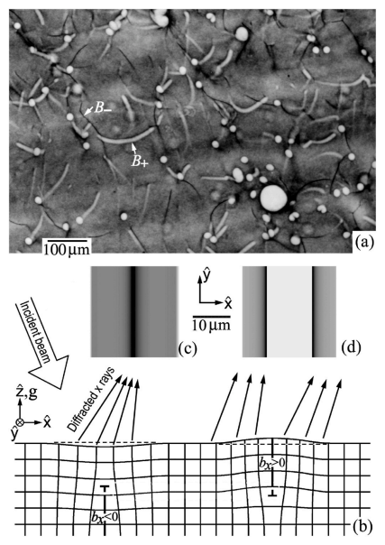 Fig. 11: Shows the back-reflection topological images of basal plane dislocations (BPDs) on 4H-SiC wafers, and the schematic diagram of the simulated edge dislocation contrast formation.