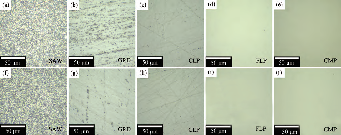 Figure 4 Optical microscope images of the C surface (a~e) and Si surface (f~j) of 4H-SiC wafer after different processing steps