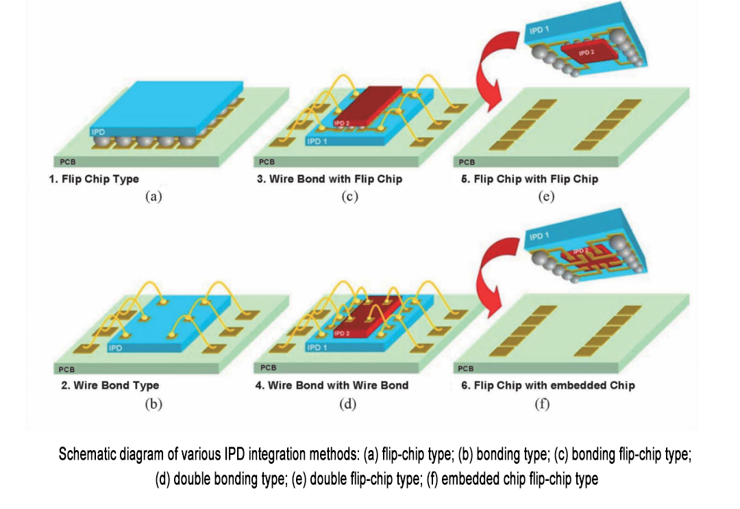 In addition to cost advantages, another advantage of IPD is its high flexibility. One of the flexibility of IPD is reflected in the diverse integration methods, as shown in the figure below. In addition to the two basic methods of directly integrating IPD into the package substrate through the flip-chip process as shown in Figure (a) or the bonding process as shown in Figure (b), another layer of IPD can be integrated on one layer of IPD as shown in Figures (c)-(e) to achieve a wider range of passive device combinations.